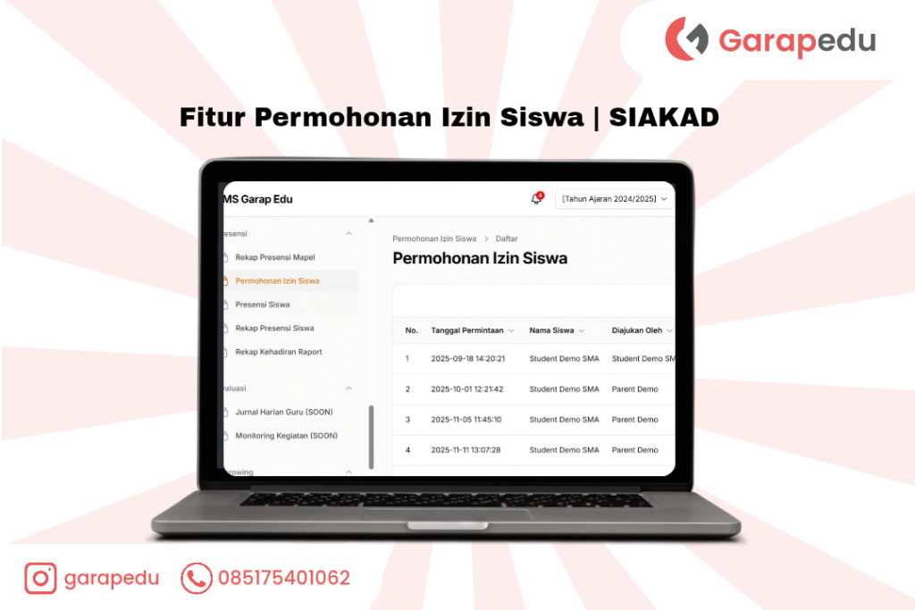 Menu Pemohonan Izin Siswa adalah fitur yang digunakan untuk mengelola dan memverifikasi pengajuan izin yang diajukan oleh siswa maupun orang tua melalui aplikasi GarapEdu.