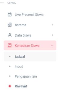 Menu Riwayat Kehadiran adalah fitur yang digunakan untuk melihat catatan absensi siswa secara lengkap. Di dalam menu ini, pengguna dapat melihat daftar kehadiran berdasarkan tanggal, status kehadiran, serta informasi detail lainnya.